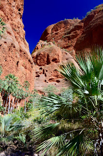 We headed to the north of the ranges where the rock formations were quite different with fissures in the rocks creating tall chasms. We once again set off intermittently striding and stumbling - and now sweating - along a riverbed that made its way to and disappeared into the rock face. The palms silhouetted against the red rock backlit by the clear blue sky. We continued along an increasingly narrowing Raider’s of the Lost Ark style winding path. On and in we went, huge boulders trapped between the walls above us (we had no hard hats!), the chasm now winding, the space between the walls narrower and narrower, we clambered up and over boulders blocking our way - twice with the help of a conveniently placed ladder - to the end of the Echidna Chasm. Here the sunlight poured in as a spotlight illuminating the chasm from high above. Next time we will come and camp in the park as there is so much to see and feel here.